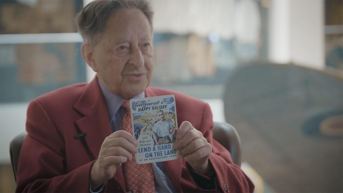 'Lend a hand on the land'Right?And that meant you spentpart of your summer holidayon a farmhelping the farmer bring in his crop.The first time I went was with the school,and when I got there,I was told that I was the smallestboy there, so I would work in the kitchen.So although I'd volunteered,very keen and enthusiasticto go and help the farmer,I was washing dishes for fortnight.Fortunately, every other year the war,I went with other people and I was helpingthe farmer and had a wonderful timeas well as being useful.This is the publicity that was put outby the governmentalong with many, many, many other things.Just: 'Give yourself a happy holiday:Lend a hand on the land.'And that's what we did.