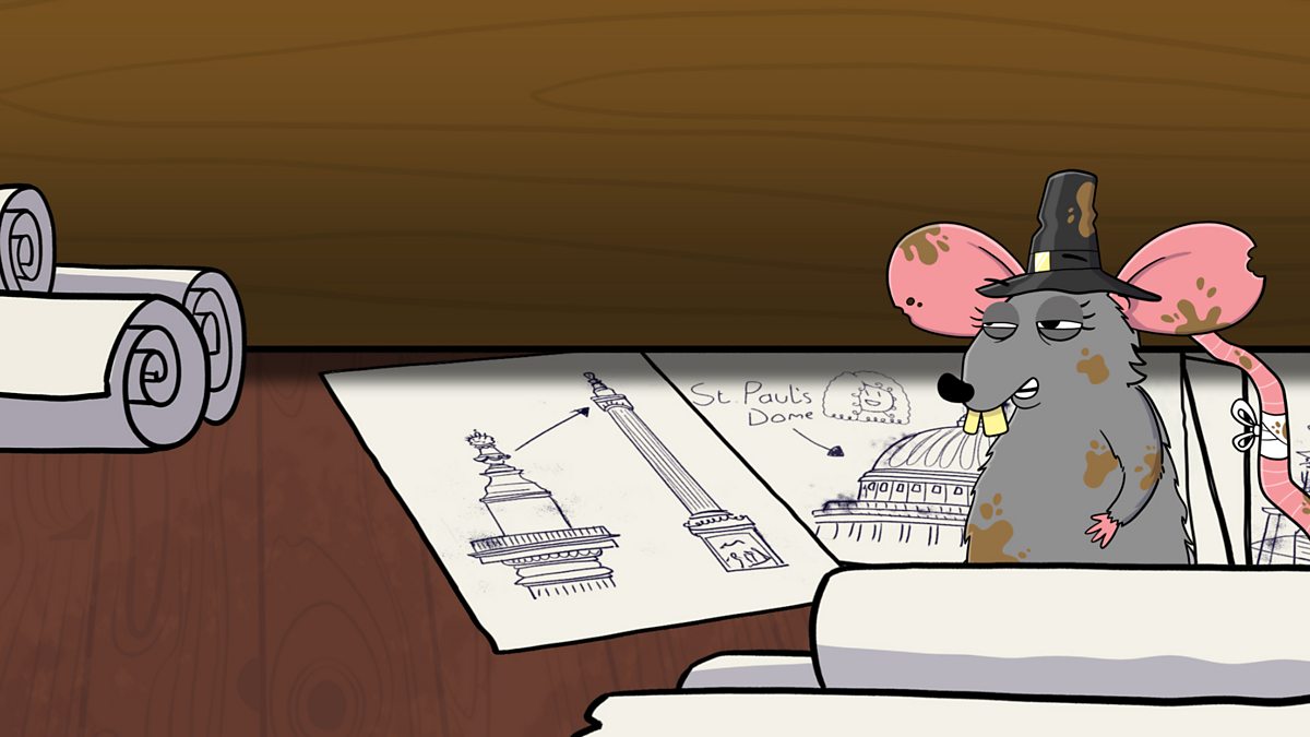 It took Sir Christopher Wren 35 years to build St Paul’s. And he used a dome instead of a steeple. Sir Christopher Wren also helped design a tall stone column called ‘The Monument’. A Monument is something that helps us remember. You can still see The Monument in London today. It’s very tall and if it was laid on its side the tip would touch the place in Pudding Lane where the fire first started. But I don’t need to visit the Monument to remember the fire. I’ve got my grandma’s stories to remember. Oh and she even taught me a rhyme to remember the year it happened. In sixteen hundred and sixty six London burnt like rotten sticks’. Mmm I like rotten sticks…