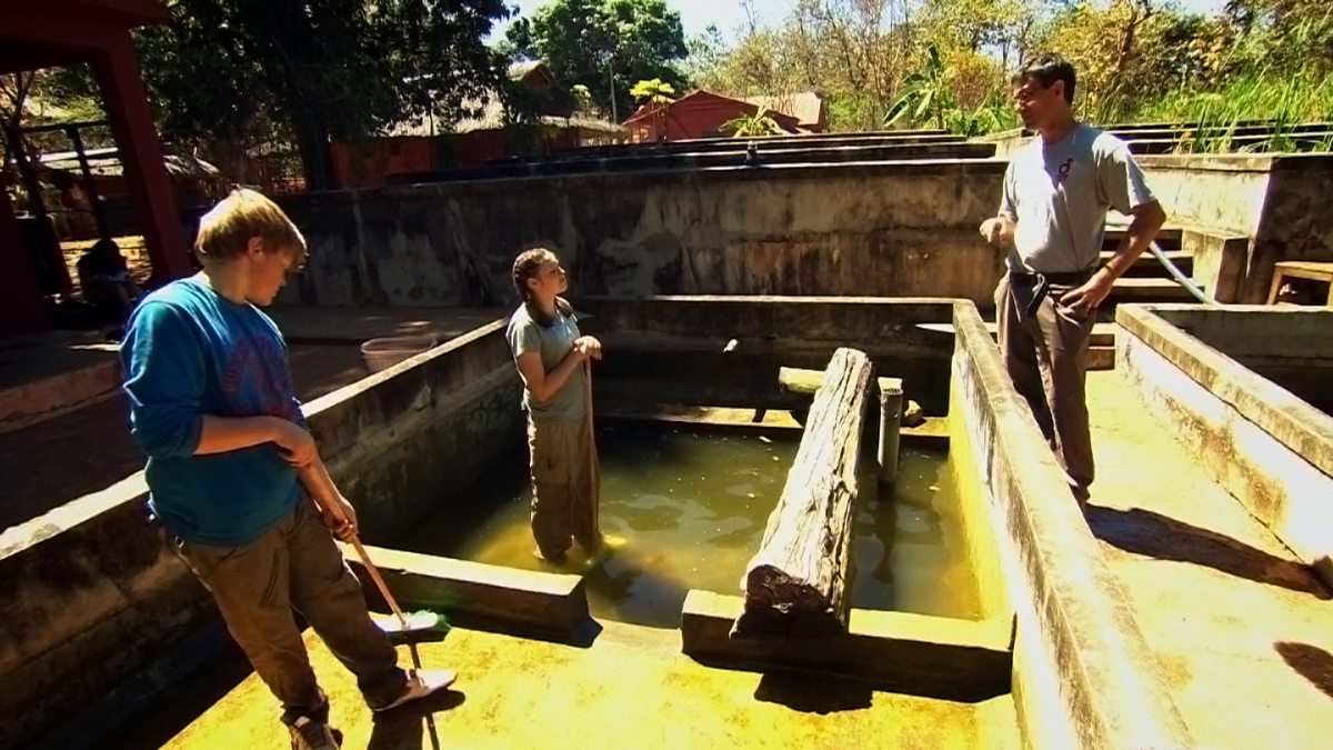 Part two of the video introduces the teenagers to a conservation project for turtles which works with local people. Turtles are bred in the safety of a reserve and when they are big enough are released into the wild - specifically into a lake deemed sacred by the local people. The video asks the audience to consider which conservation project is the more successful.