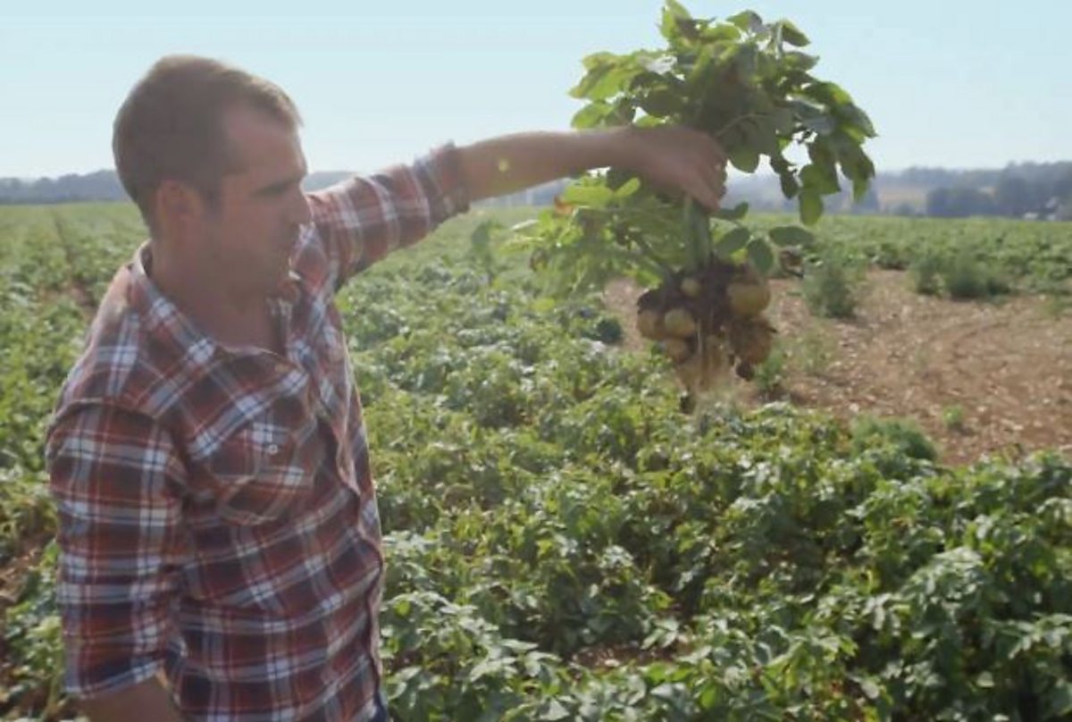 Dr Chris van Tulleken introduces the clip. He visits a farm and digs up a potato plant.