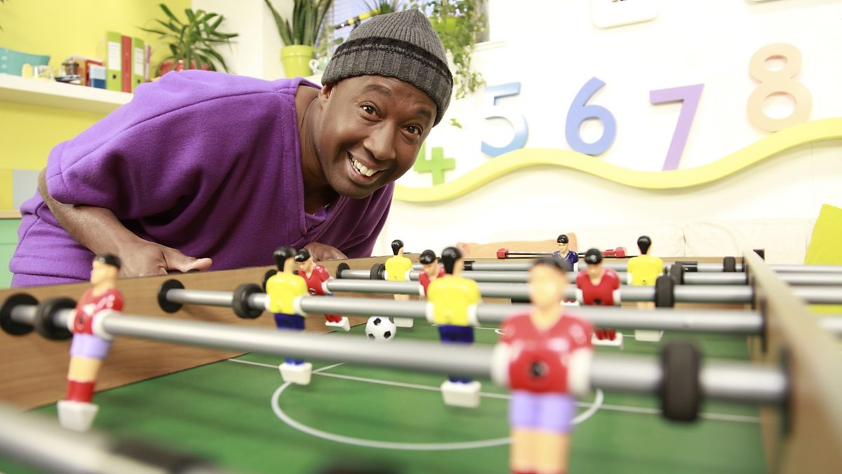 The children ‘blow down’ one of Rodd’s playpeople footballers, and then join in a ‘keepy-uppy’ game involving a number track.