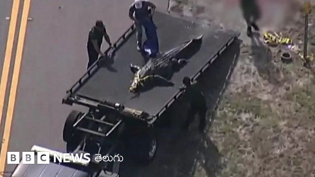 అధికారులు, మీడియా సిబ్బంది మధ్యన రోడ్డు పక్కన భారీ అలిగేటర్ పడి ఉన్న దృశ్యాలు న్యూస్ ఫుటేజీలో కనిపించాయి..
