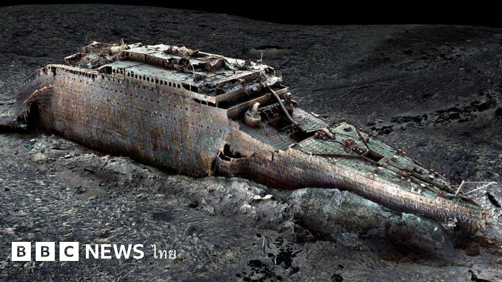 ภาพจำลองของซากเรือไททานิคที่จมอยู่ใต้น้ำลึกลงไป 3,800 เมตร ในน่านน้ำอันหนาวเหน็บของมหาสมุทรแอตแลนติก สร้างขึ้นโดยภาพที่ถ่ายจากหุ่นยนต์ใต้น้ำ โดยภาพสแกนดังกล่าวประกอบขึ้นจากภาพถ่ายมากกว่า 700,000 ภาพ ที่ถ่ายจากทุกมุมถูกนำมาใช้ เพื่อสร้าง "ฝาแฝดทางดิจิทัล" ซึ่งบีบีซีนิวส์เคยนำมาเปิดเผยไว้เมื่อปี 2023