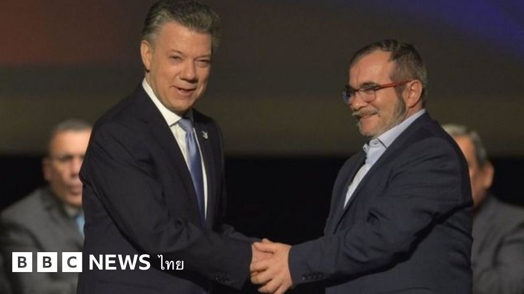 นายฮวน มานูเอล ซานโตส ประธานาธิบดีโคลอมเบีย และนายโรดริโก ลอนโดโน หรือ "ทิโมเชงโก" ผู้นำกองกำลังติดอาวุธเพื่อการปฏิวัติแห่งโคลอมเบีย หรือกลุ่มฟาร์ก ซึ่งเคลื่อนไหวต่อสู้รัฐบาลโคลอมเบียเป็นเวลานานกว่า 40 ปี ร่วมลงนามในข้อตกลงสันติภาพฉบับปรับปรุงใหม่ในกรุงโบโกตา เมืองหลวงของโคลอมเบีย เมื่อวานนี้ (24 พ.ย.) เพื่อหวังจะยุติสงครามความขัดแย้งในประเทศซึ่งทำให้มีผู้เสียชีวิตแล้วกว่า 260,000 คน