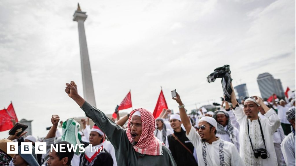 กลุ่มผู้ชุมนุมชาวมุสลิมในอินโดนีเซียราว 200,000 คน รวมตัวกันบริเวณอนุสรณ์สถานแห่งชาติ (MONAS) ใจกลางกรุงจาการ์ตา หลังทำพิธีละหมาดเสร็จสิ้น ช่วงเช้าวันนี้ (2 ธ.ค.)