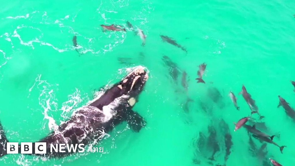 นายไจเมน ฮัดสัน ชาวออสเตรเลีย ใช้โดรนติดกล้องวิดีโอบันทึกภาพที่น่าตื่นตาของวาฬตัวหนึ่งที่ดูเหมือนกำลังแหวกว่ายเล่นน้ำกับฝูงโลมาบริเวณทะเลนอกชายฝั่งตะวันตกของออสเตรเลีย
