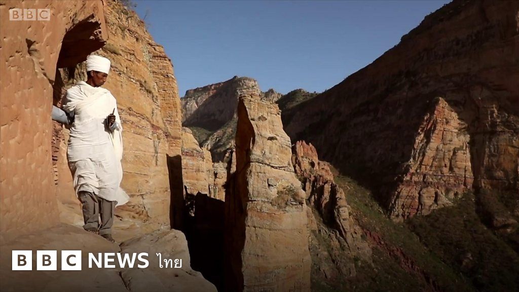 นักบวชคริสต์ปีนเขาไปโบสถ์ริมหน้าผาในเอธิโอเปีย