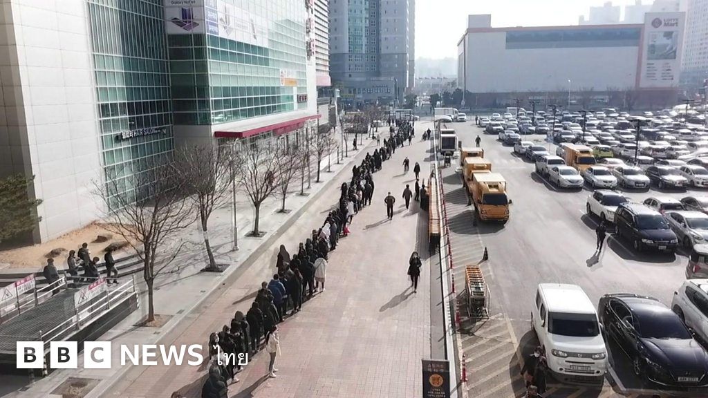 โคโรนา : ภาพถ่ายทางอากาศแสดงให้เห็นคนเกาหลีใต้ต่อแถวยาวรอเข้าซูเปอร์มาร์เก็ตที่เมืองแทกู