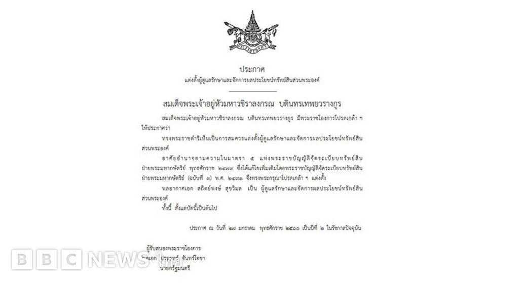 เว็บไซต์ราชกิจจานุเบกษา เผยแพร่ประกาศแต่งตั้งผู้ดูแลรักษาและจัดการผลประโยชน์ทรัพย์สินส่วนพระองค์ มีความว่า สมเด็จพระเจ้าอยู่หัวมหาวชิราลงกรณ บดินทรเทพยวรางกูร มีพระราชโองการโปรดเกล้า ฯ ให้ประกาศว่า ทรงพระราชดําริเห็นเป็นการสมควรแต่งตั้งผู้ดูแลรักษาและจัดการผลประโยชน์ทรัพย์สินส่วนพระองค์ อาศัยอํานาจตามความในมาตรา 5 แห่งพระราชบัญญัติจัดระเบียบทรัพย์สิน ฝ่ายพระมหากษัตริย์ พุทธศักราช 2479 ซึ่งได้แก้ไขเพิ่มเติมโดยพระราชบัญญัติจัดระเบียบทรัพย์สิน ฝ่ายพระมหากษัตริย์ (ฉบับที่ 3) พ.ศ. 2491 จึงทรงพระกรุณาโปรดเกล้า ฯ แต่งตั้ง พลอากาศเอก สถิตย์พงษ์ สุขวิมล เป็นผู้ดูแลรักษาและจัดการผลประโยชน์ทรัพย์สินส่วนพระองค์