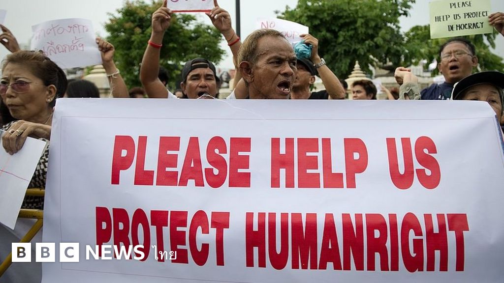 คำบรรยายภาพ, "กรุณาช่วยเราปกป้องสิทธิมนุษยชน" ป้ายของผู้ประท้วงเรียกร้องการเลือกตั้งกล่าว (แฟ้มภาพ)