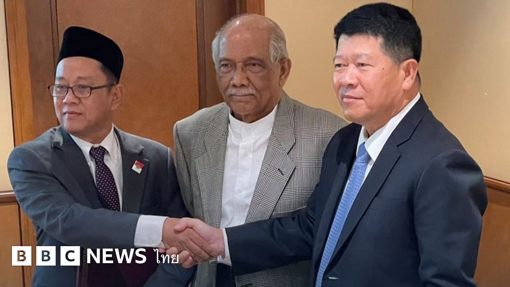 คำบรรยายภาพ, อานัส อับดุลเราะห์มาน หัวหน้าคณะบีอาร์เอ็น (ซ้าย) จับมือกับ พล.อ.วัลลภ รักเสนาะ หัวหน้าคณะพูดคุยสันติสุขฯ (ขวา) โดยมีตันซรี อับดุล ราฮิม บิน โมฮัมหมัด นอร์ ผู้อำนวยความสะดวกจากมาเลเซีย อยู่ตรงกลาง