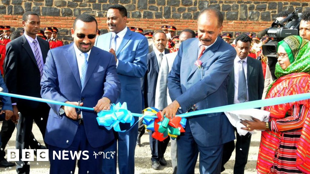 ቀዳማይ ሚኒስተር ኢትዮጵያ ኣብይ ኣሕመድን ፕረዚደንት ኤርትራ ኢሳይያስ ኣፍወርቅን፡ ባንዴራ ኢትዮጵያ ብምስቃል እዮም ነቲ ኤምባሲ ብዕሊ ከፊቶምዎ።
