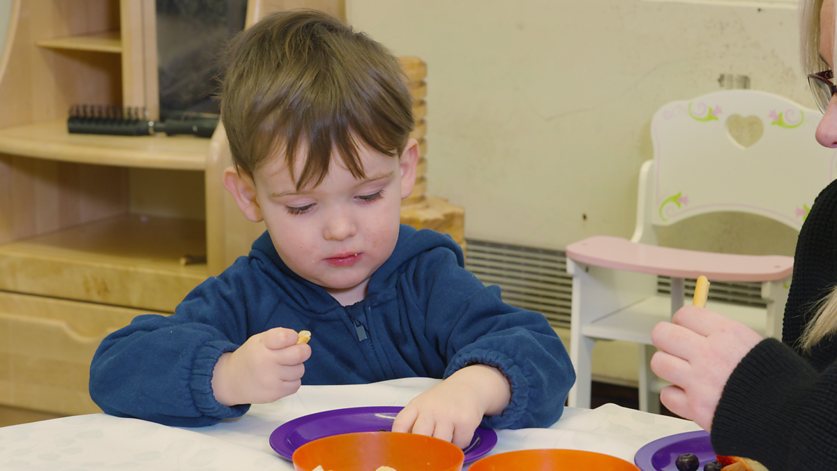 What have we got for snack today?What's in this one?Banana?Does Jack like banana? Yeah!BananaOh, banana.Wow. That was a big piece of banana.Teddy's go round.Teddy bear's going around.Teddy's going round the roundabout.There's the birdyWhere's the birdy?Here. Up there. Do you thinkthat's where baby birdy is?The baby birdy's up there.Yeah.In the house.In a house.In the bird house.Ooh, look at that.It's nice and shiny.Me.And me, there we go.It's your turn.It's my turn.Okay, I can have a go.What shall I draw?Circle, Bella.A circle for Bella, here you go!More nana.You want more banana?More banana, please.