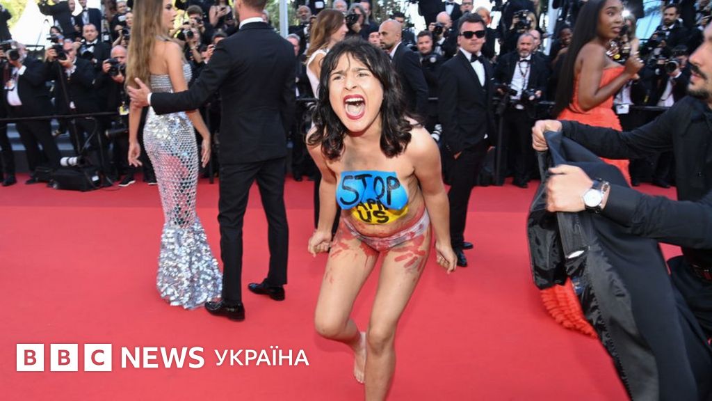 На червону доріжку вибігла гола активістка із прапором України на грудях. Її білизна була вимазана криваво-червоною фарбою у вигляді відбитків рук. Це був протест проти сексуального насильства російських військових. "Припиніть нас ґвалтувати", - кричала жінка.