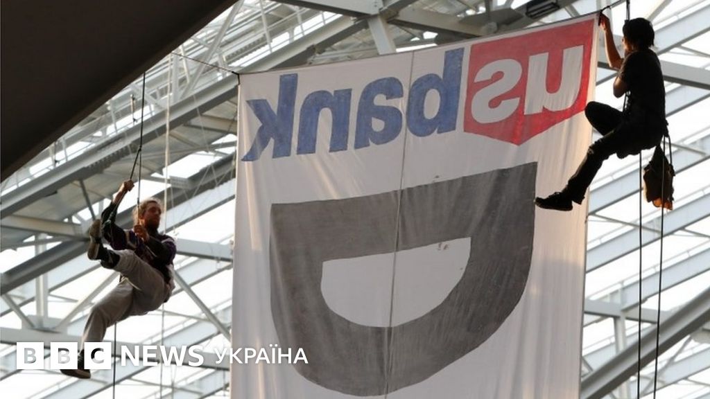 Чоловік і жінка вивісили на висоті величезний банер із закликом до місцевого банку US Bank відмовитися від участі в проекті.
