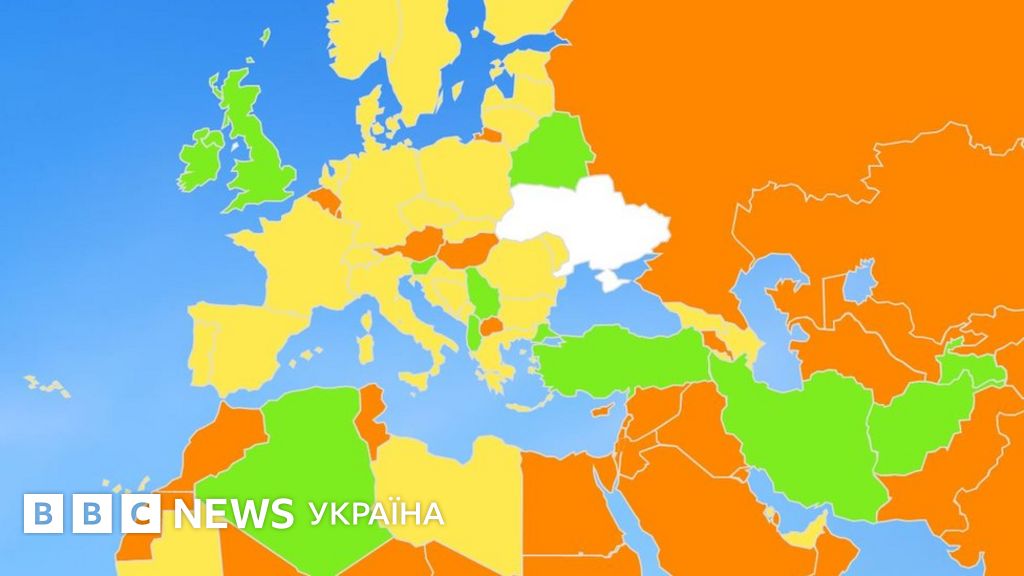 Усі країни розфарбовані у три кольори: помаранчевим позначені держави, куди в'їжджати наразі заборонено, жовтим - куди можна в'їхати за наявності посвідки на проживання, та зеленим - куди в'їзд дозволений.