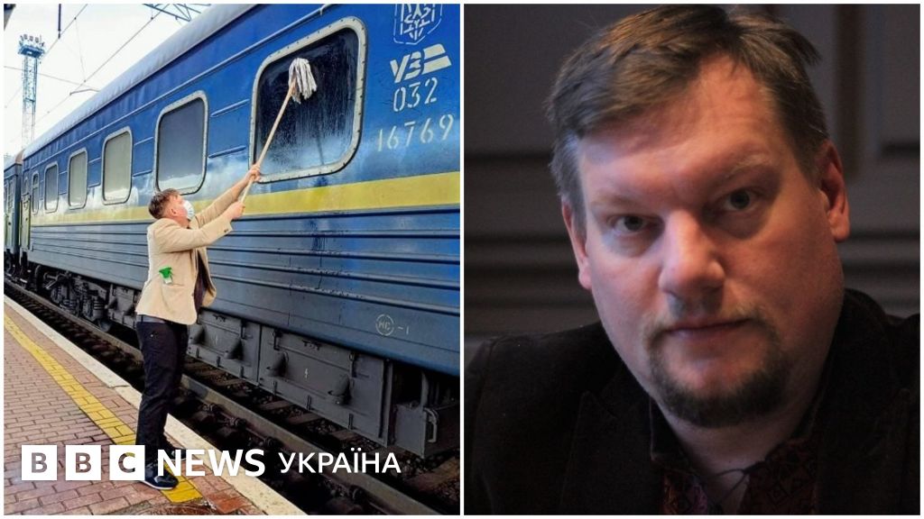 На самому фото чоловік у піджаку миє шваброю вікно у звичайному вагоні "Укрзалізниці".