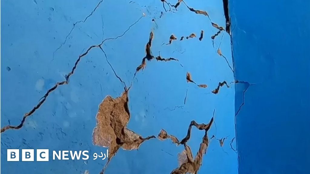نیلے رنگ کے کمرے کی دیواریں ٹوٹی پھوٹی ہیں اور ان میں بڑے شگاف نظر آتے ہیں۔ ایسی صورت حال میں اس چھت کے نیچے کھڑا ہونا بھی شاید محفوظ نہ ہو۔