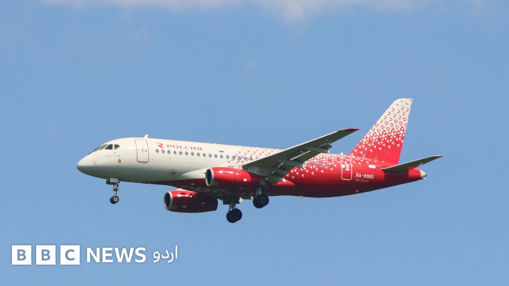 سفید اور سرخ رنگ کا روسیا سخوئی سپر جیٹ 100 روس کے شہر سینٹ پیٹرز برگ کے پلکووو ائیرپورٹ پر اترنے کی تیاری کر رہا ہے