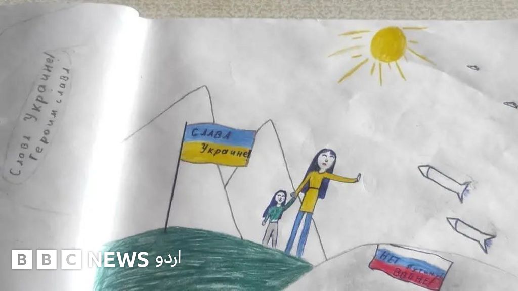 ڈرائنگ میں روسی جھنڈے کی جانب سے یوکرین کی طرف میزائل اڑتے ہوئے دکھائے گئے تھے اور درمیان میں ایک خاتون ایک بچی کا ہاتھ تھامے میزائلوں کو روک رہی ہیں۔