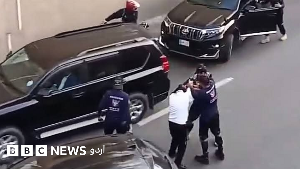 جمعرات کے روز سے پاکستان کے سوشل میڈیا پر ایک ویڈیو وائرل ہے جس میں دیکھا جا سکتا ہے کہ سڑک پر موجود ایک انڈر پاس کی فاسٹ لین میں دو سیاہ رنگ کی ویگو گاڑیاں اور دو ایس یو ویز کھڑی ہیں جن سے برآمد ہونے والے مسلح سکیورٹی گارڈز میں سے ایک گارڈ نزدیک کھڑی سفید گاڑی کے ڈرائیو پر اپنی گن کی مدد سے حملہ آور ہے۔