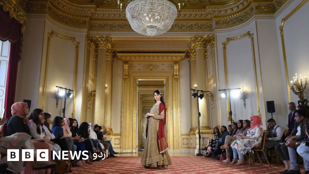 ،تصویر کا کیپشنیہ شو لندن کے تاریخی لینکاسٹر ہاؤس میں ہوا جس میں 36 ڈیزائنرز کے تیار کردہ ملبوسات تھے۔