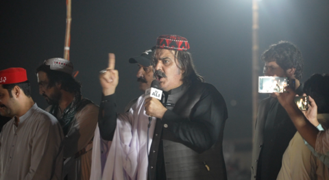 علی امین گنڈا پور کا کہنا ہے کہ ’یہاں پر سیاسی بات نہیں کریں گے بلکہ روایات اور حق کی بات کریں گے۔ حق کے لیے یا اپنا سر پھاڑیں گے یا پہاڑ چیریں گے۔‘