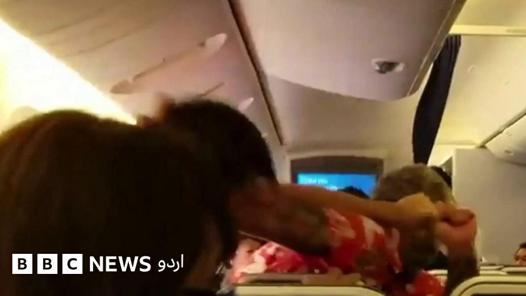 جاپانی جہاز پر سوار سرخ شرٹ میں ملبوس شخص کی مسافروں سے منہ ماری اور ہاتھا پائی