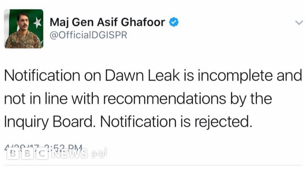 خیال رہے کہ میجر جنرل آصف غفور باجوہ نے اپنی 29 اپریل کی ٹویٹ میں کہا تھا کہ 'ڈان لیکس کے حوالے سے جاری کیا گیا اعلان انکوائری بورڈ کی سفارشات کے مطابق نہیں ہے۔ یہ نوٹیفیکیشن مسترد کیا جاتا ہے۔'