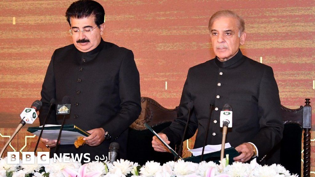 وزیراعظم شہباز شریف سیاہ رنگ کی شیروانی میں ملبوس تھے اور ان کے چہرے پر سنجیدگی عیاں تھی۔ حلف برداری کی تقریب کے مناظر بھی گذشتہ برس سے مختلف تھے۔