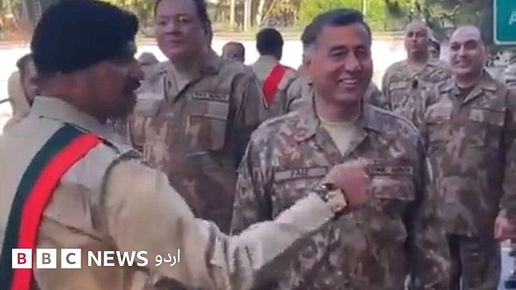 یہ سابق ڈی جی آئی ایس آئی لیفٹیننٹ جنرل فیض حمید ہیں اور ان کے ہمراہ 76ویں لانگ کورس کے دیگر افسران بھی موجود ہیں۔ ان افسران نے اپنے یونیفارم پر رینکس نہیں لگائے ہوئے اور یہ اپنے سامنے موجود ’ڈرل سٹاف‘ سے نہ صرف ہنستے ہوئے ڈانٹ کھا رہے ہیں بلکہ ان کا ہر حکم بجا لاتے ہیں۔