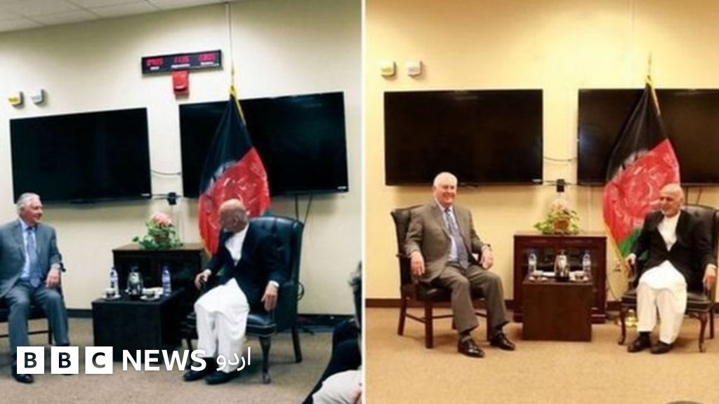 امریکہ کی جانب سے جاری کی گئی تصویر میں ٹلرسن کو افغانستان کے صدر اشرف غنی سے بگرام ایئر بیس پر ایک بغیر کھڑکی والے کمرے میں دیکھا جا سکتا ہے جہاں دیوار پر امریکہ کی فوجی گھڑی اور سرخ رنگ کا ایک فائر الارم لگا ہوا ہے۔