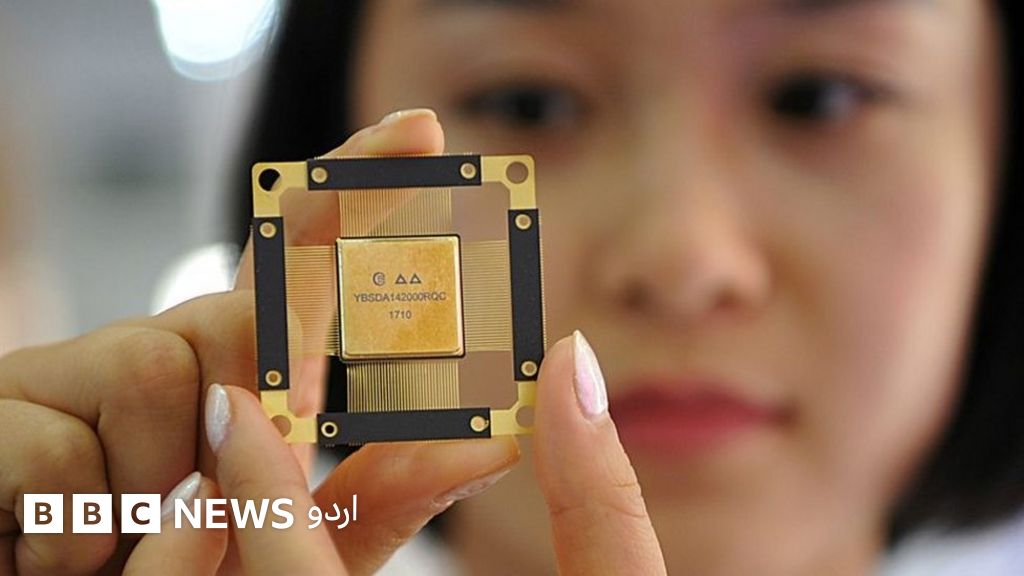 ،تصویر کا کیپشناپریل 2018 میں ہونے والی ’فرسٹ ڈجیٹل چائنا سمٹ‘ کے موقع پر فائیو جی نیٹورک میں استعمال ہونے والی چِپ کی نمائش کی گئی تھی
