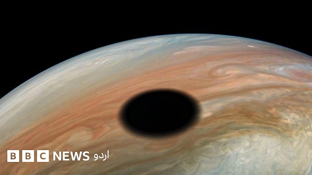 مشتری کے مدار میں لی گئی اس اس تصویر میں ایک دائرہ نما چیز کے گرد گھومتے ہوئے بادلوں کو دیکھا جا سکتا ہے۔