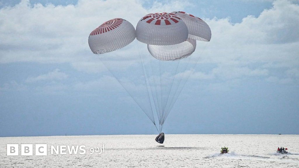 چار پیراشوٹس نے لینڈنگ سے پہلے اس کیپسول کی رفتار بتدریج گھٹائی جہاں سپیس ایکس کی کشتیاں اُنھیں لینے کے لیے پہنچ گئیں۔