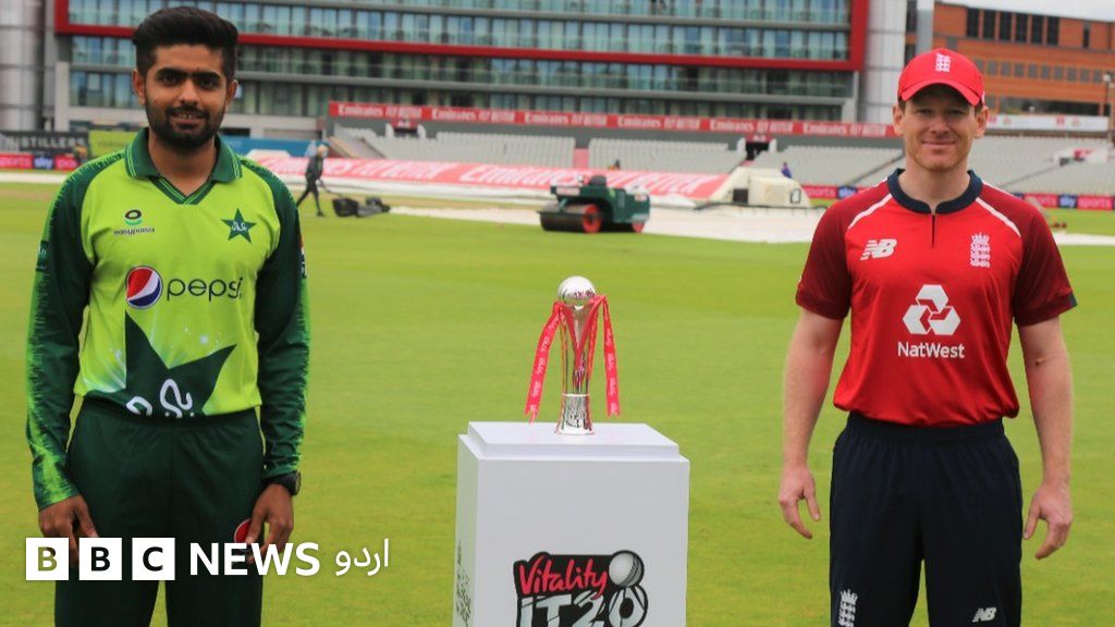 ،تصویر کا کیپشنپاکستان کے کپتان بابر اعظم اور انگلینڈ کے کپتان اوئن مورگن، ٹی ٹوئنٹی سیریز کی ٹرافی کے ساتھ کھڑے ہیں
