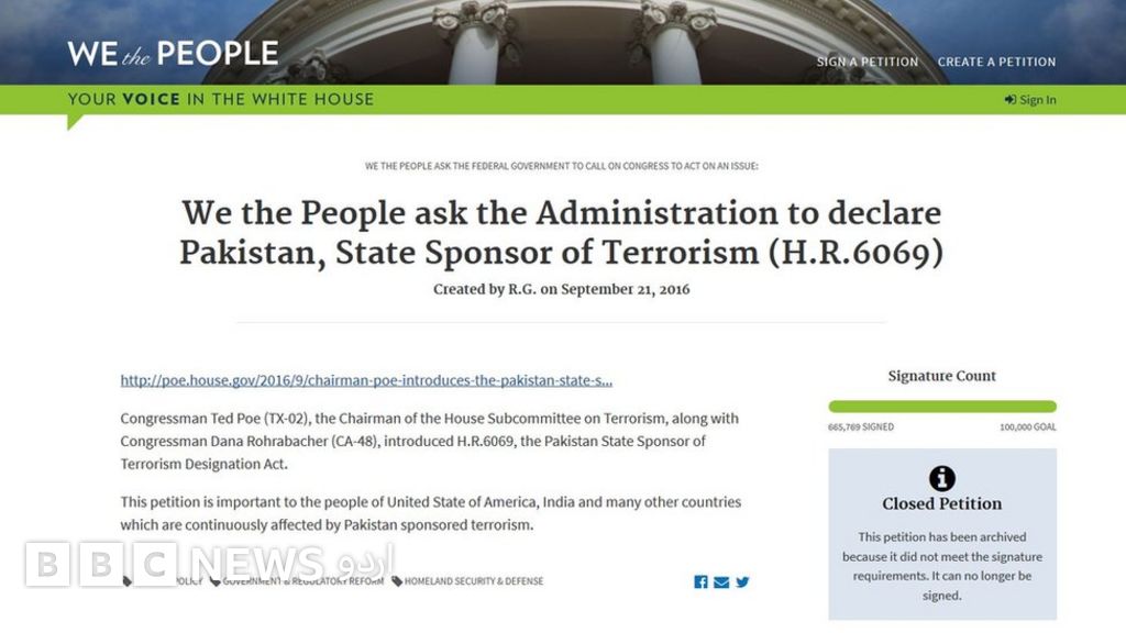پاکستان کو امریکی حکومت کی جانب سے ایک دہشتگرد یا دہشتگردی کی کفیل ریاست قرار دینے کے لیے شروع کی جانے والی ایک آن لائن پٹیشن کو وائٹ ہاؤس نے بند کر دیا ہے۔