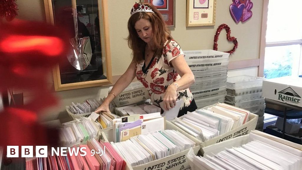 یہاں پر جمع عمررسیدہ رضاکار خواتین ماضی کے مشہور نغمے ’لیٹ میں بی یور سویٹ ہارٹ‘ (مجھے اپنا محبوب بنا لو) کی دھن پر گنگناتے ہوئے گذشتہ دو ہفتوں سے بہت مصروف ہیں اور دنیا بھر سے ہزاروں کی تعداد میں بھیجے جانے والے ویلنٹائن ڈے کے پیغامات پر اس قصبے کی مہر لگا کر آگے روانہ کر رہی ہیں۔
