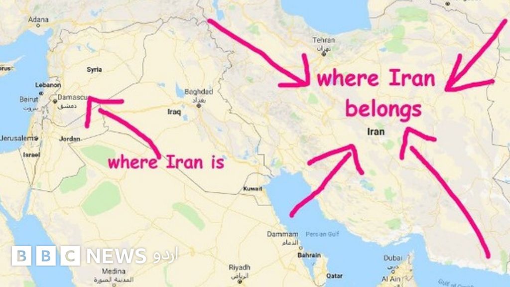 اس نقشے کے ساتھ لکھی عبارت میں کہا گیا ہے: ’ایران، لگتا ہے تم بھٹک گئے ہو۔ یہ لو‘۔