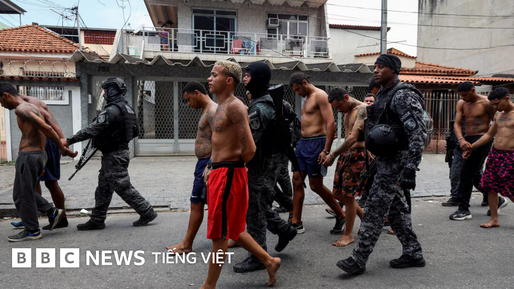 Chụp lại hình ảnh, Các thành viên của đơn vị đặc nhiệm cảnh sát khống chế nghi phạm buôn ma túy trong một chiến dịch truy quét tội phạm ma túy tại một khu ổ chuột thuộc khu liên hợp Penha, thành phố Rio de Janeiro, Brazil, ngày 28/10/2025