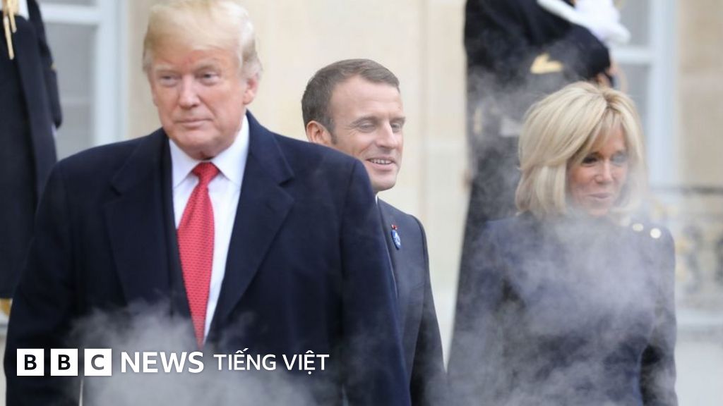 Chụp lại hình ảnh, Khói bay ra từ ống xả chiếc xe hơi có tên The Beast đón Tổng thống Donald Trump khi ông chia tay Tổng thống Pháp Emmanuel Macron (giữa) và phu nhân Brigitte Macron (phải) tại Điện Elysee ở Paris vào ngày 10/11/2018