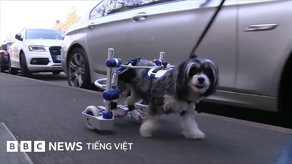 Chó Puffy bị liệt nay đi lại được nhờ xe lăn.