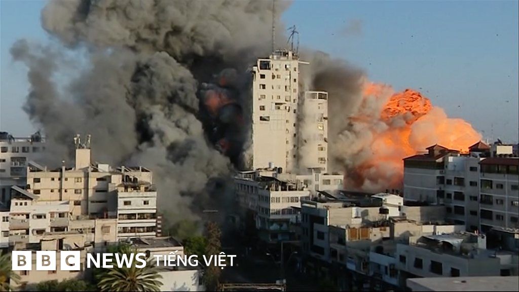 Khoảnh khắc một tòa tháp ở Gaza đổ sập