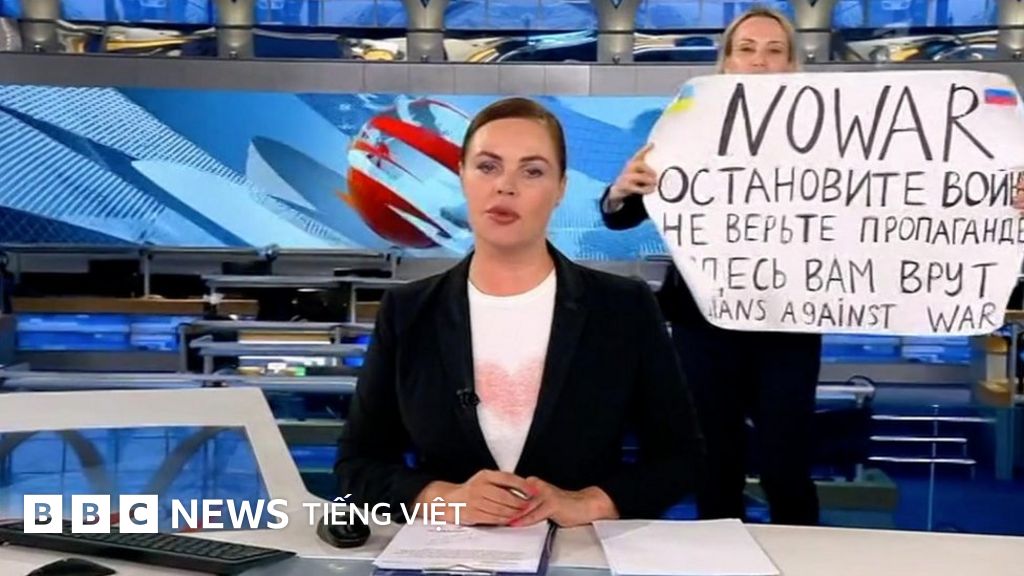 Đây là khoảnh khắc một nhà báo nữ cầm tấm biển phản đối chiến tranh xuất hiện ngay giữa chương trình thời sự buổi tối của Kênh 1, kênh truyền hình nhà nước của Nga, hôm tối thứ Hai 14/3.