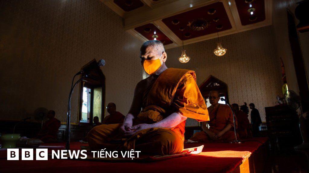 Tối trước hôm tình trạng khẩn cấp có hiệu lực, một vị sư đeo khẩu trang tụng kinh cầu nguyện cho Thái Lan chóng qua cơn dịch bệnh.