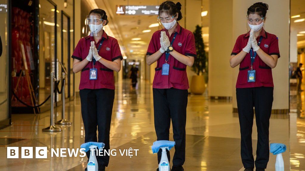 Chụp lại hình ảnh, Nhân viên của Siam Paragon Mall, Bangkok Thailan, mang thiết bị bảo vệ đứng vái chào khách hôm 17/5